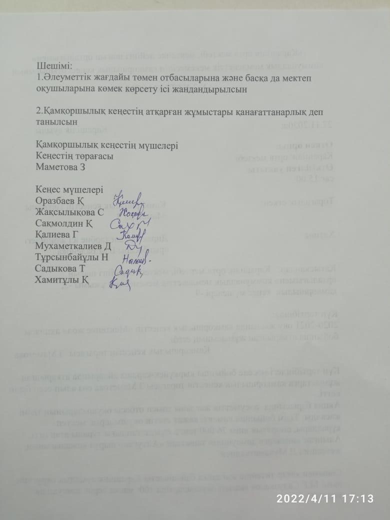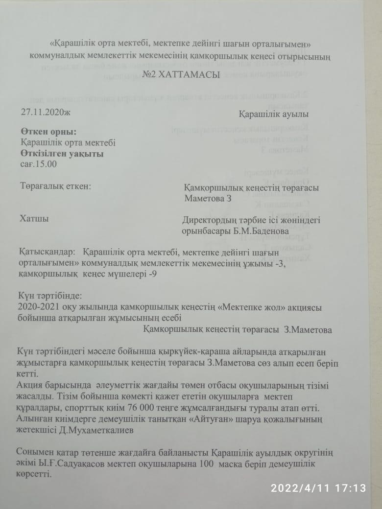 Қамқоршылық кеңестің отырысы » "Қарашілік орта мектебі, мектепке дейінгі шағын орталығымен" коммуналдық мемлекеттік мекемесі