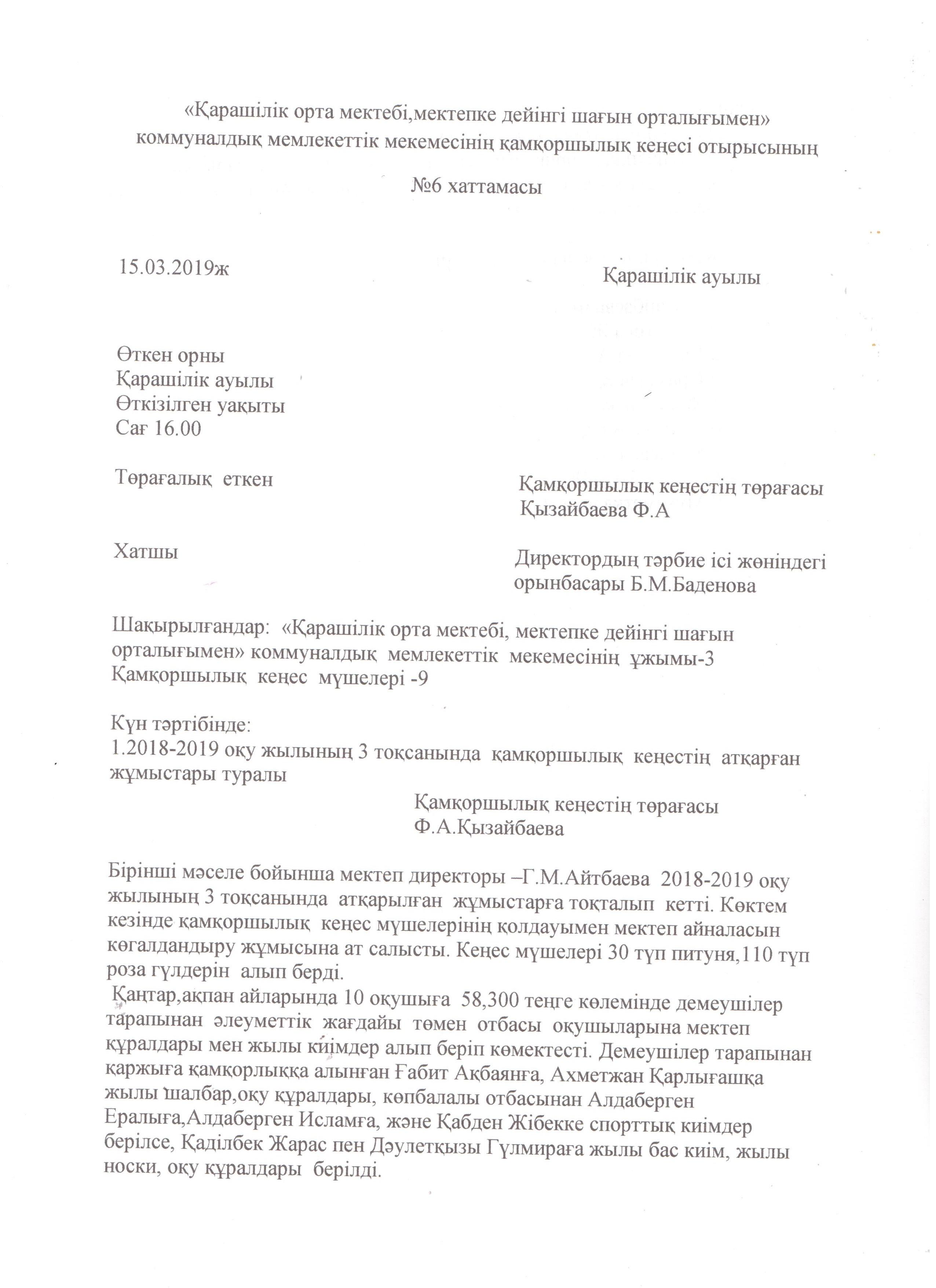 Қамқоршылық кеңестің хаттамасы » "Қарашілік орта мектебі, мектепке дейінгі шағын орталығымен" коммуналдық мемлекеттік мекемесі