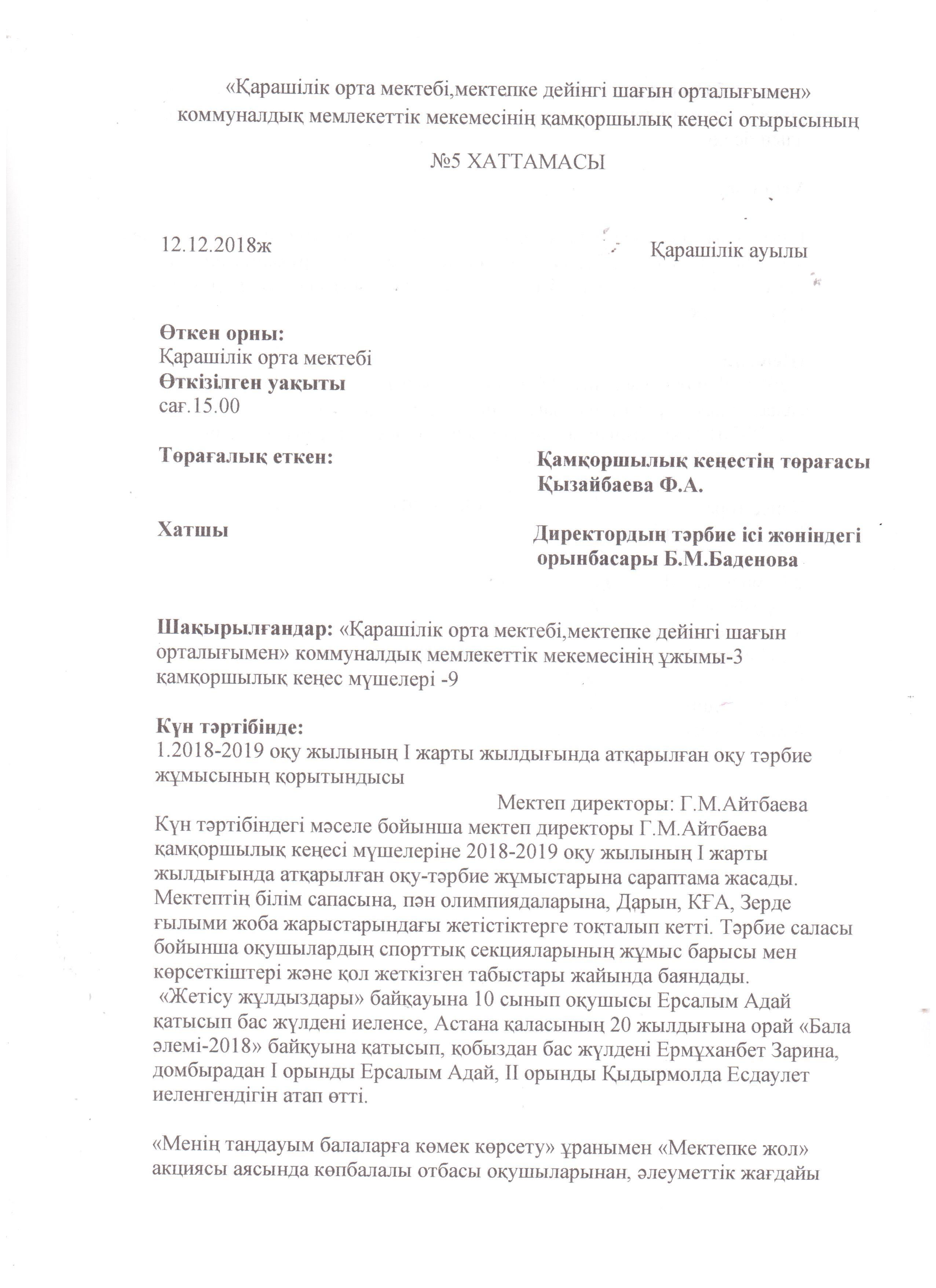 Қамқоршылық кеңестің хаттамасы » "Қарашілік орта мектебі, мектепке дейінгі шағын орталығымен" коммуналдық мемлекеттік мекемесі