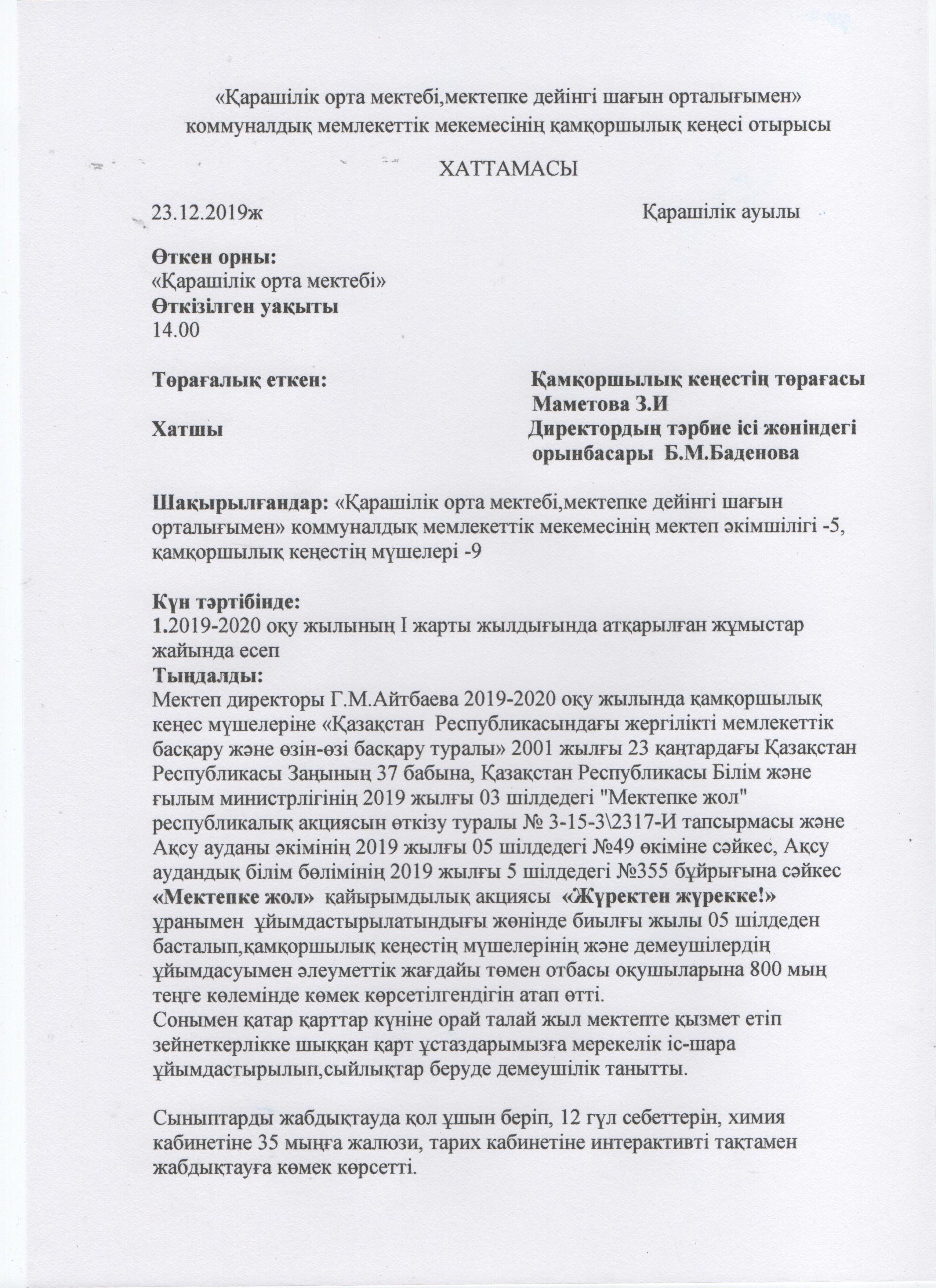 қамқоршылық кеңес » "Қарашілік орта мектебі, мектепке дейінгі шағын орталығымен" коммуналдық мемлекеттік мекемесі