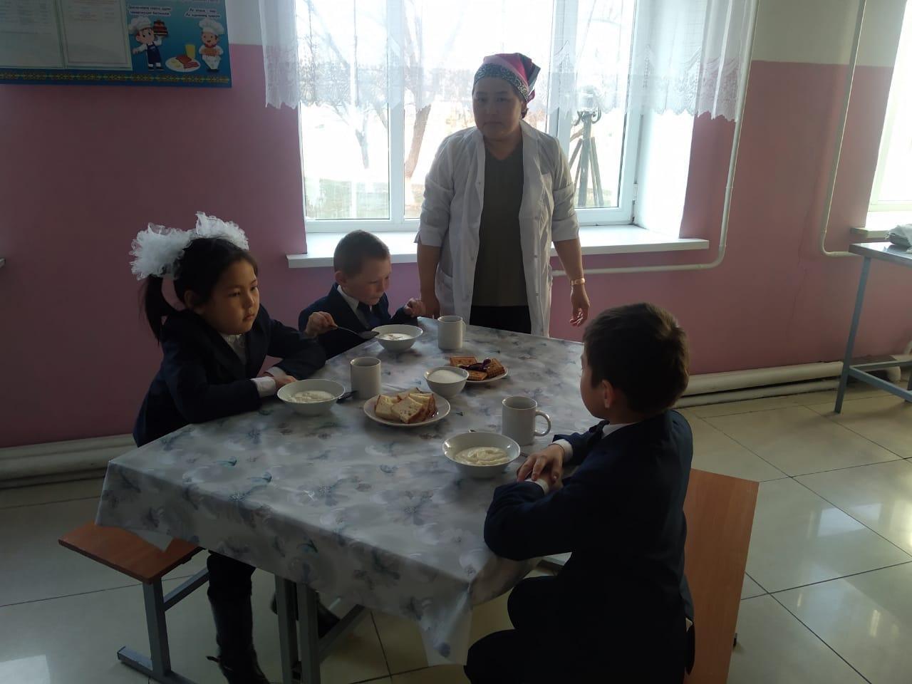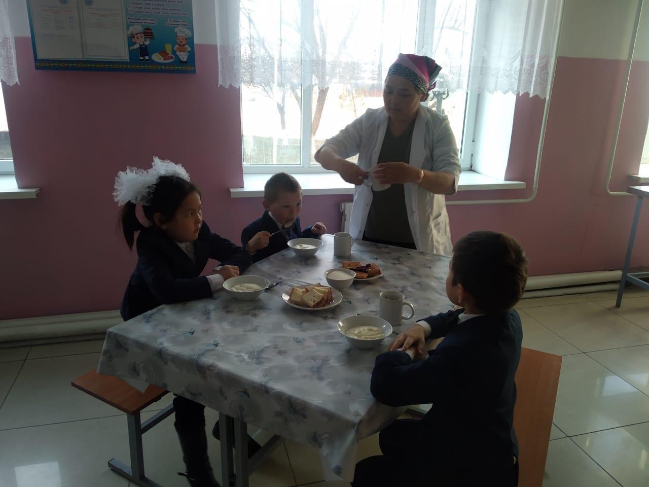 Оқушылар екі ауысымда тамақтанады. Бірінші ауысымда 4 оқушы, екінші ауысымда 16 оқушы тамақтанады.