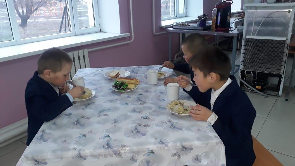 Оқушылар екі ауысымда тамақтанады. Бірінші ауысымда 3 оқушы, екінші ауысымда 14 оқушы тамақтанады.